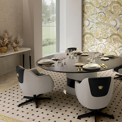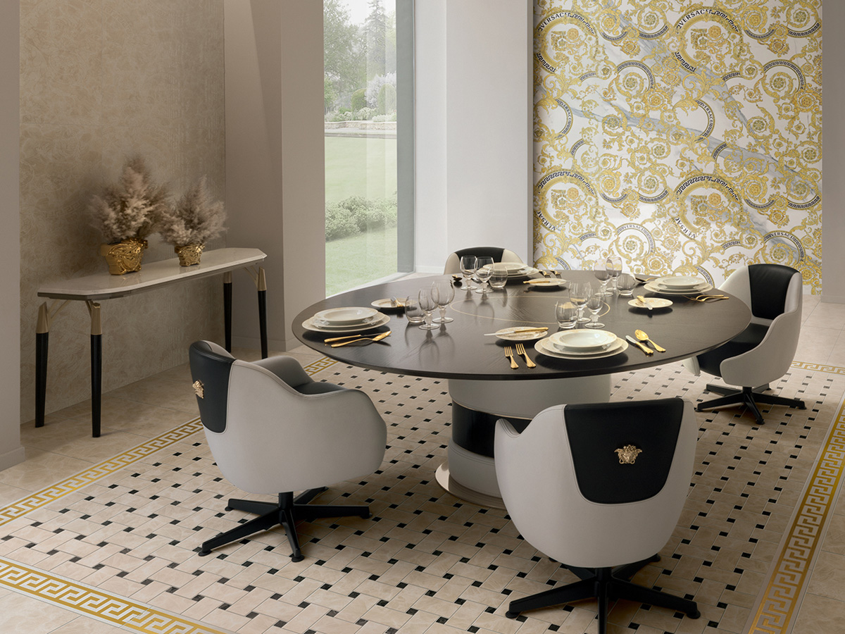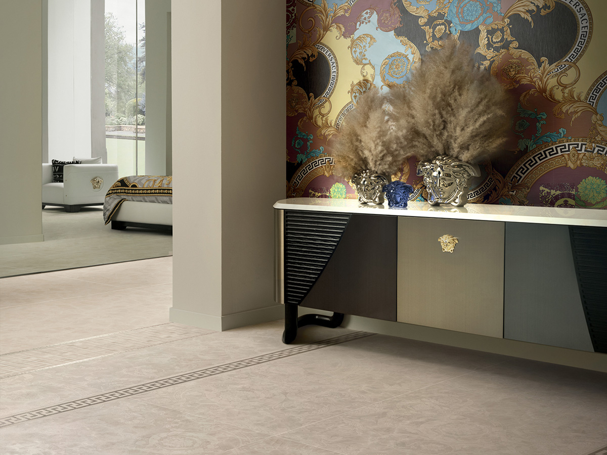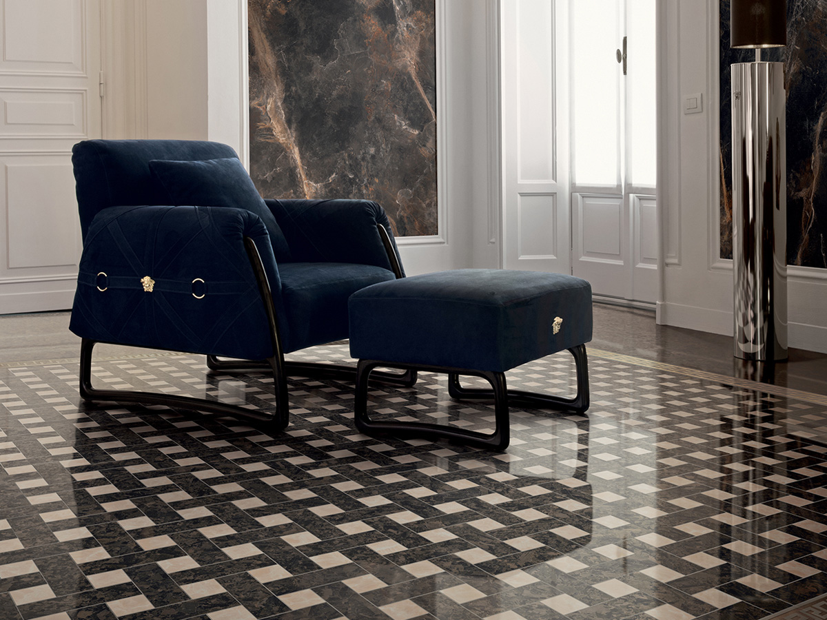 Коллекция керамогранита и керамических декоров для стен и пола Meteorite от Versace с имитацией натурального камня идеально подходит для современных премиальных интерьеров. Красочные декоры дополняют крупноформатные плиты и придают интерьеру законченный вид. Интерьер от Версаче подчеркнет вашу индивидуальность и без слов расскажет о высоком статусе.